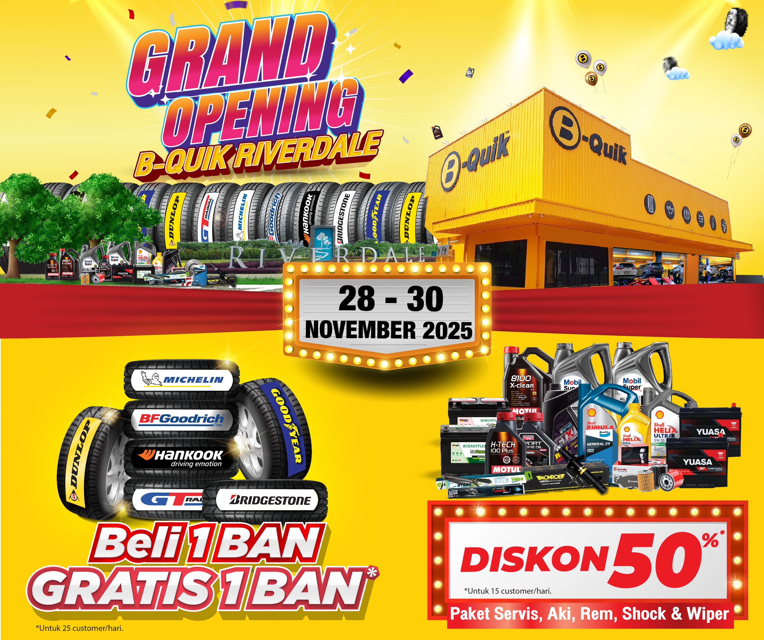 Pendaftaran promo Beli 1 Gratis 1 ban dan promosi Velg SSW dilakukan di B-Quik Riverdale pada 28 - 30 November 2025 mulai pukul 06:00 – 07:30