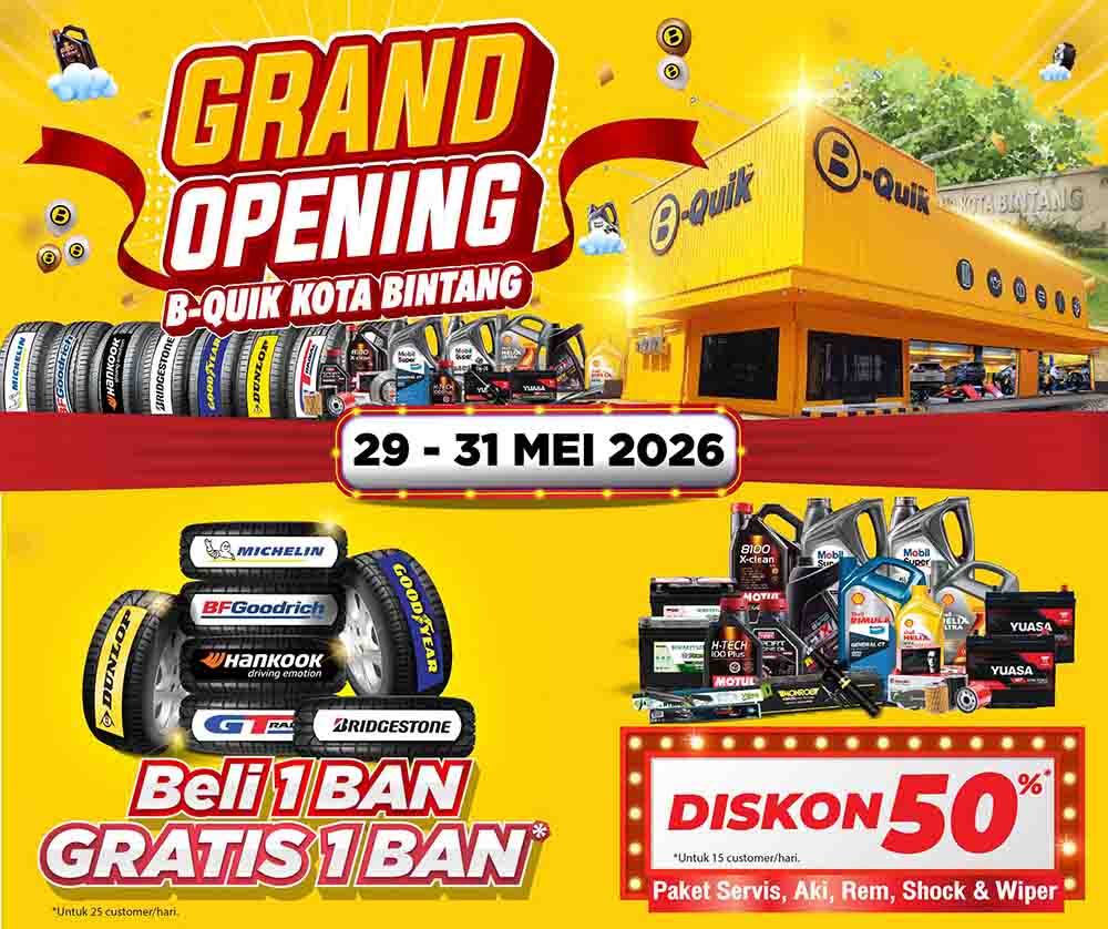 Pendaftaran promo Beli 1 Gratis 1 ban dan promosi Velg SSW dilakukan di B-Quik Kota Bintang pada tanggal 29-31 Mei 2026 mulai pukul 06:00 – 07:30